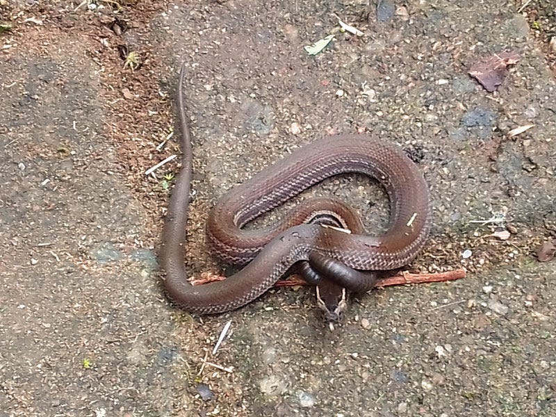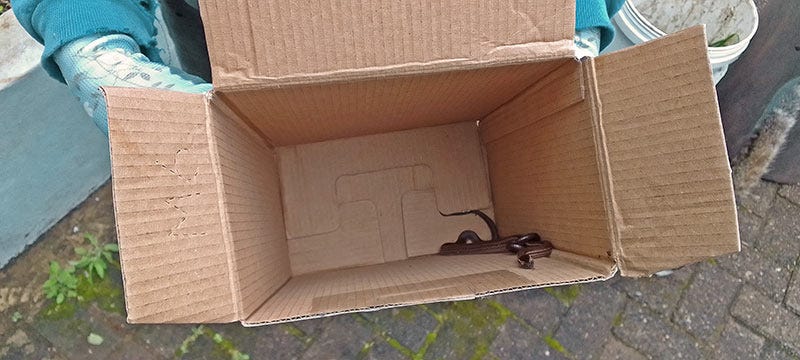 In the images below, note that gardening gloves are not a prerequisite for the job. We just happened to be gardening when we found the snake!