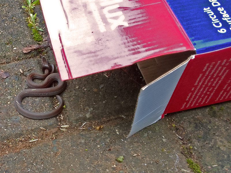 - Wait for the snake to move, adjusting the box into the snake's path as necessary. Don’t hurry, don’t force it, just give it a little time if needed. Sooner or later the snake will seek safety inside the cardboard box.
