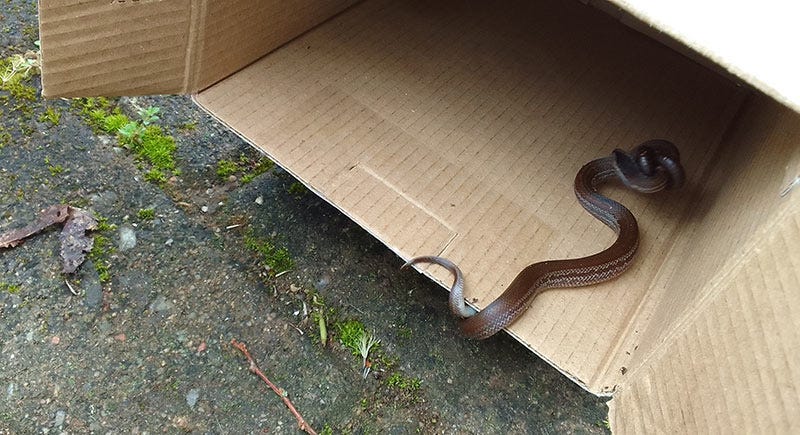 - Wait for the snake to move, adjusting the box into the snake's path as necessary. Don’t hurry, don’t force it, just give it a little time if needed. Sooner or later the snake will seek safety inside the cardboard box.