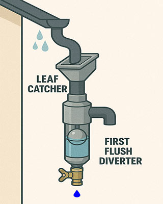 The principle of a First Flush Diverter is based on the fact that when there is no rain, both the roof and the gutter will accumulate sand, dust and other particles that are too small to be stopped by a leaf catcher. When the rain starts, these particles will be washed down from the roof and gutter. Therefore the first runoff will be relatively dirty, but anything after that will be clean water. All we need to do is to prevent the first runoff from going into the tank. This is what the First Flush Diverter does.